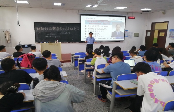 )党委书记张启春教授介绍了我校创新创业教育理念与实践,并结合具体参赛经历,向同学们展现了我校对创新创业的重视以及同学们在各大赛事中取得的丰硕成果,激发了同学们的参赛热情。