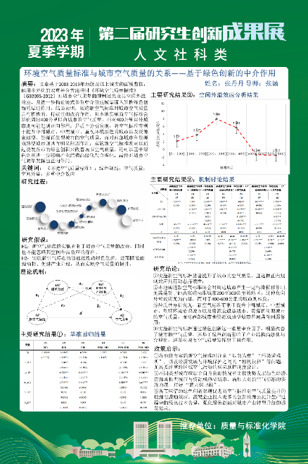 张丹丹同学做了题目是《环境空气质量标准与城市空气质量的关系研究——基于绿色创新的中介效应》的报告,基于2003-2019年地级及以上城市的面板数据,运用多元化的双重差分方法探讨《环境空气质量标准》(GB3095-2012)对城市空气质量的规制效果及其空间外溢效应,并进一步构建链式多重中介效应模型深入解析绿色创新的渠道作用。