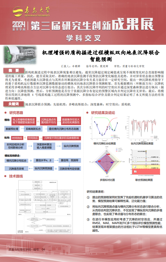 牟朝群同学作了题为《机理增强的盾构掘进过程横纵双向地表沉降联合智能预测》的汇报。考虑到最大沉降值点与其所在环断面的沉降分布关系方面存在一定研究空间,提出一种沉降机理指导下的基于盾构机运行数据和沉降监测数据驱动的横纵双向地表沉降联合预测框架,同时发挥了先验机理和机器学习算法的优势,实现了横纵双向沉降的多维度联合,预测结果可解释性高、泛化能力强。