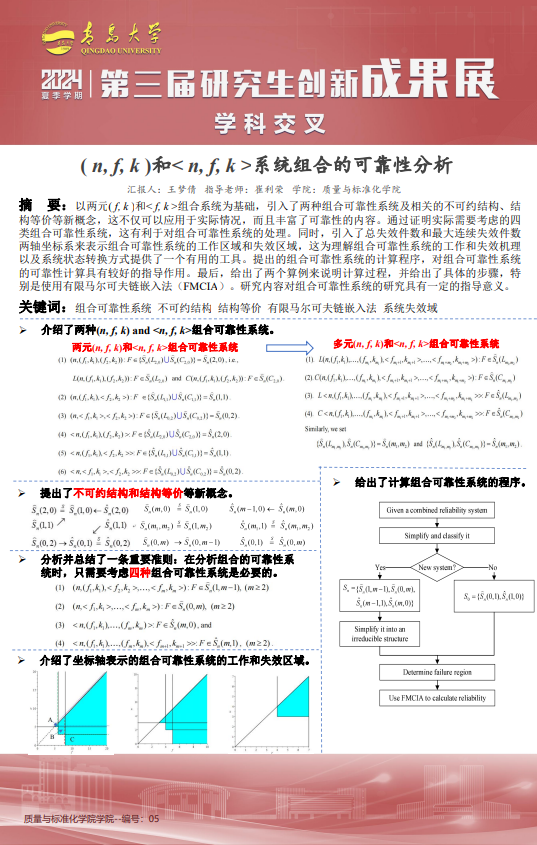 王梦倩同学作了题为《(n, f, k)和< n, f, k >系统组合的可靠性分析》的汇报,以两元(f, k)和< f, k >组合系统为基础,通过证明实际需要考虑的四类组合可靠性系统并引入了总失效件数和最大连续失效件数两轴坐标系来表示组合可靠性系统的工作区域和失效区域,提出的组合可靠性系统的计算程序,对组合可靠性系统的可靠性计算具有较好的指导作用。