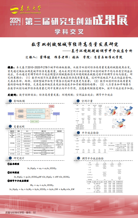 窦伟健同学做了题为《数字双创赋能城市经济高质量发展研究——基于环境规制的调节效应分析》的汇报,基于2010-2020年278个城市的面板数据,从数字双创对经济高质量发展的赋能视角出发,首先通过熵权法测度城市经济发展质量,进而采用空间方法分析数字双创对城市平均与异质空间溢出效应,尽而通过有调节的中介效应模型识别赋能路径及环境规制在赋能过程中的调节方向与强度。