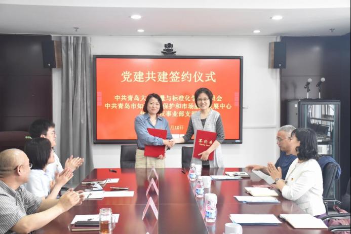委员会与中共青岛市知识产权保护和市场服务发展中心知识产权事业部支部举行党建共建签约仪式。我院党委书记张嵩、党委副书记张磊一行5位同志,青岛市知识产权公共服务平台主任刘建志、党支部书记张宁等5位同志参加了签约仪式。