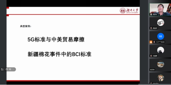 侯俊军教授系统地介绍了双循环中标准与高水平对外开放的相关研究问题,主要围绕双循环新发展格局、典型案例、国内标准的相对供给情况、中国标准面临的主要问题四个方面。候教授以全新的视角展示了区别于欧盟和美国的第三种标准化模式—中国标准化模式;随后,引入两个典型案例—“5G标准与中美贸易摩擦”和“新疆棉花事件中的BCI标准”,形象地讲述了中国标准化的现状;并进一步对中国标准化与国际标准的接轨程度、中国标准在国际的使用范围以及中国标准和标准组织的现状进行探讨。