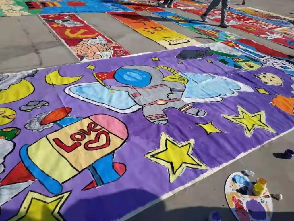 负责的部分—请。天气虽有些许寒冷,但同学们热血沸腾,恪守其职,默契十足,有条不紊地进行绘画:中国高铁跑出“中国速度”,浩瀚宇宙中宇航员挥舞着五星红旗,天安门前的十里红灯.....同学们将油然而生的自豪感及满腔的爱国热情付诸于笔端,绘制出一幅又一幅色彩绚丽的图画。