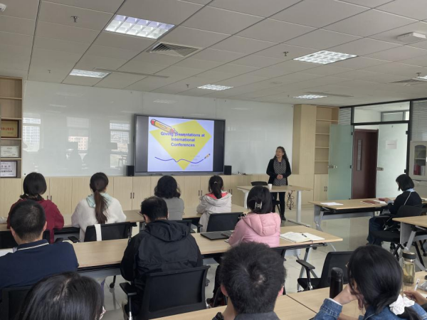 孙玉洁教授为我院师生进行了题为“Giving Presentations at International Conferences”的国际会议英语演讲交流能力培训。会议由副院长程馨主持,标准化与社会治理教研室、质量工程与可靠性教研室全体教师和学生代表参与培训。