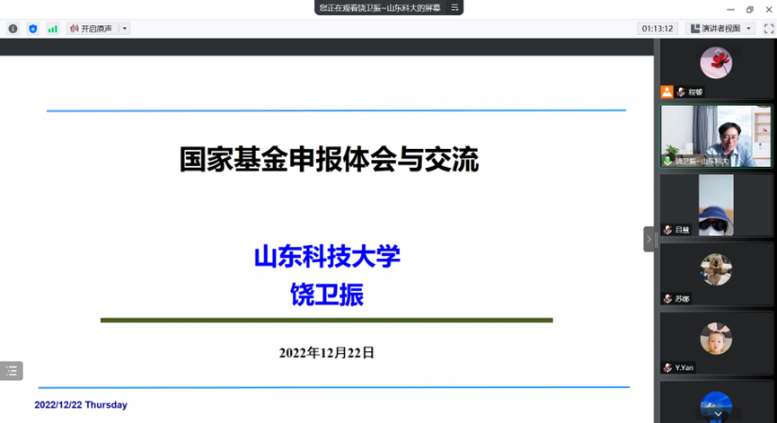 饶卫振现身说法,从个人的基本情况讲起,讲述了他本人研究方向的演变和凝练过程,进而分析了国家基金申报的路径、类型选择、评审规则以及会评程序等内容,分享了自身申报基金的心得体会,并针对国家社科基金申报书的选题注意事项、活页概要、重点难点、可行性分析、预期成果、研究基础、参考文献等内容逐一进行详细的讲解。饶教授总结自身经验以解答老师们的疑惑,并希望老师们在基金申过程中能够做到早准备、巧结合、多请教、重细节,持之以恒,全力以赴。 讲座后,参会老师与饶教授进行了深入的交流和探讨,大家受益匪浅。