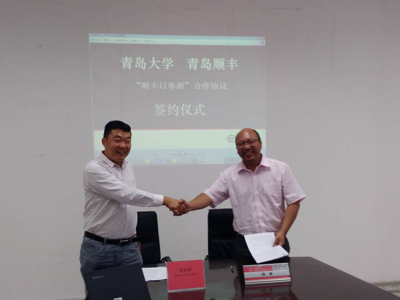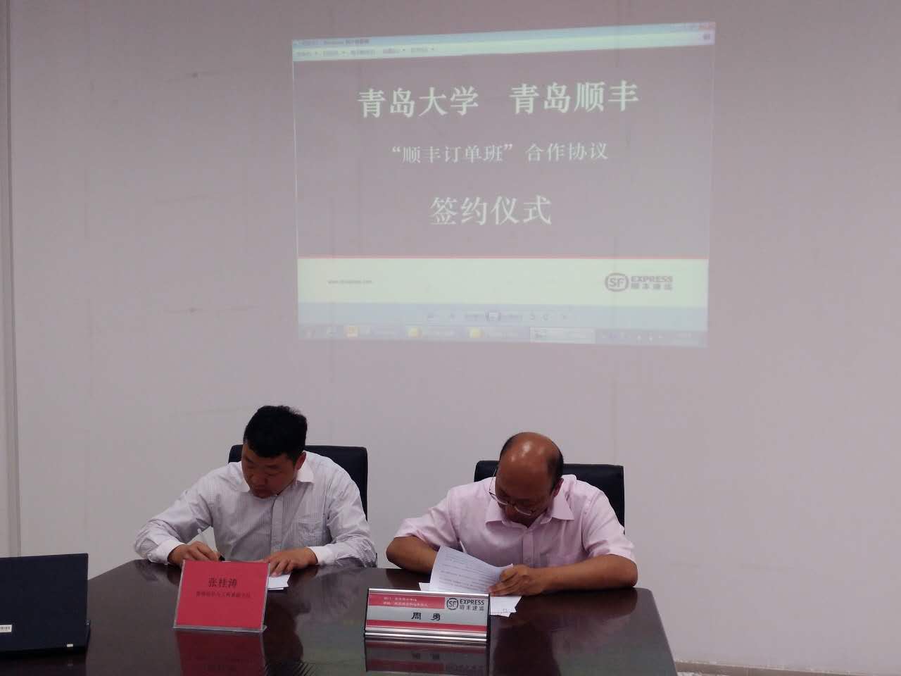 2017年5月23日,九游官网-九游棋牌 与青岛顺丰成功签约“顺丰订单班”合作协议,双方就合作协议的具体内容进行了洽谈并达成共识。管理科学与工程系主任张桂涛受九游棋牌官网 党委副书记陈崇研的委托,与青岛顺丰共享服务中心主任周勇共同在合作协议上签字。