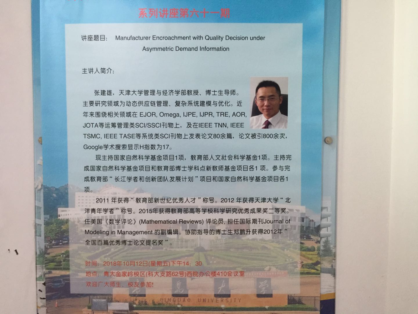 周五学术之夜第六十一期,邀请了天津大学张建雄教授来我院讲座,报告题目为 “Manufacturer encroachment with quality decision under asymmetric demand information”。九游棋牌官网