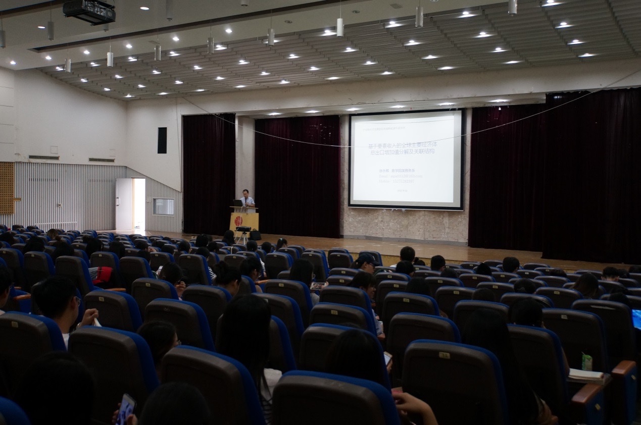 国际商务系主任徐永辉老师做了题为“基于要素收入的全球主要经济体总出口增加值分解及关联结构”的学术报告。报告从总贸易与增加值贸易之关系以及要素收入与增加值之关系问题切入,阐释了总贸易分解对于认识当代全球价值链分工结构所具有的意义,详细说明了总贸易分解方法与数据使用问题,依据总贸易增加值结构的分解结果,全景展示了当代全球主要经济体之间的增加值关联结构、特征及其政策含义,为了提高中国在全球价值链分工中的地位,在区分创新类型的基础上,阐释了国家创新体系的构建问题。