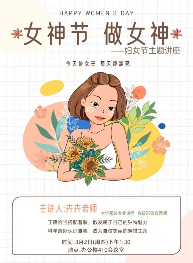 分工会、妇委会分会于3月2日下午1:30于办公楼410会议室举行“气质穿搭的美学探究”讲座。本次讲座的主讲人是:大学服装专业讲师、高级形象管理师周珍卉老师。本次讲座旨在帮助大家认清自己的风格,了解各种风格所适合的穿搭,实现发现美,追求美的美好愿望。