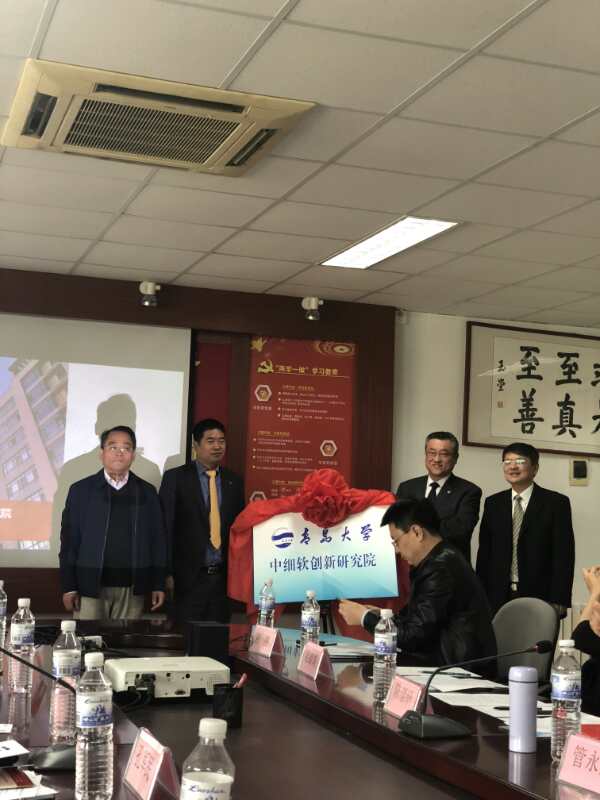 管永建书记、孔军民董事长、焉岿然处长和王道民博士共同为青岛大学中细软创新研究院揭牌。