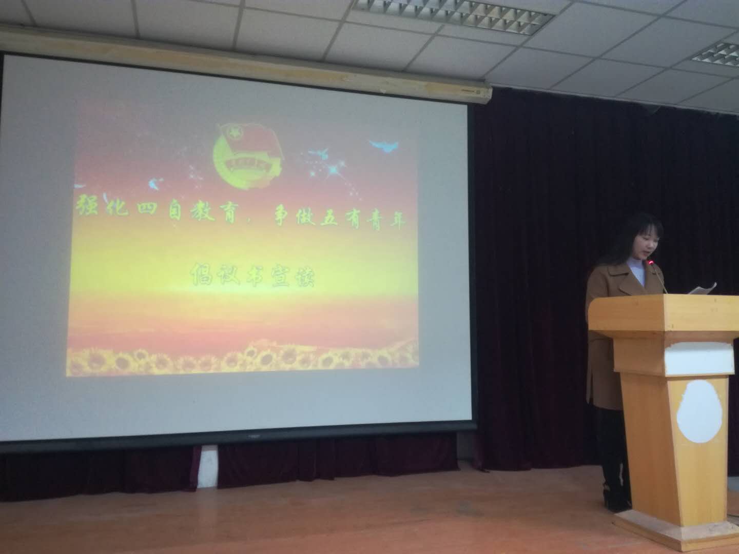 学生会主席房舒宣读倡议书,号召青年朋友们自觉学习学校党委对青年提出的“四自”、“五有”期望和要求,严格自律标准,提升自身能力,从而更好的服务社会。