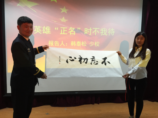 大学生德育导师、中国人民解放军92212部队干部科韩泰松少校为学生做了“英雄正名,时不我待”的精彩报告,并向入党积极分子提出两项行动要求:从英雄魂上净化灵魂,书写忠诚;从英雄气上凝聚力量,练就本领。韩少校还结合自身经历分别回答了同学们关心的问题。