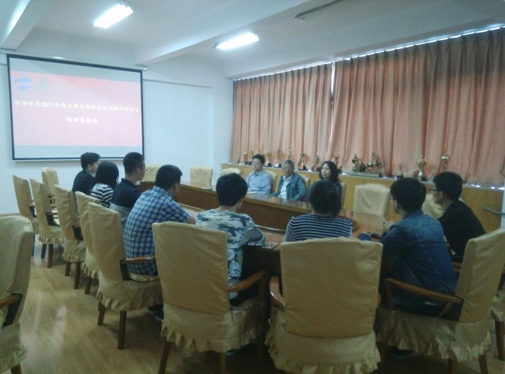 2016年5月19日下午,市场学系2015年度校级大学生创新创业训练计划项目结题答辩会在中心校区睿思楼325会议室顺利举行。出席答辩会的有市场学系副主任罗作汉老师、副教授全冬梅老师和市场学系辅导员房征岩老师。参加答辩的一共有三个项目组,三个项目组分别派代表进行了ppt展示答辩。
