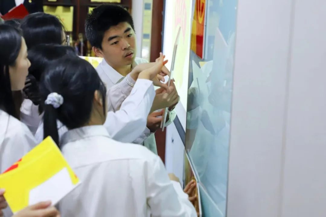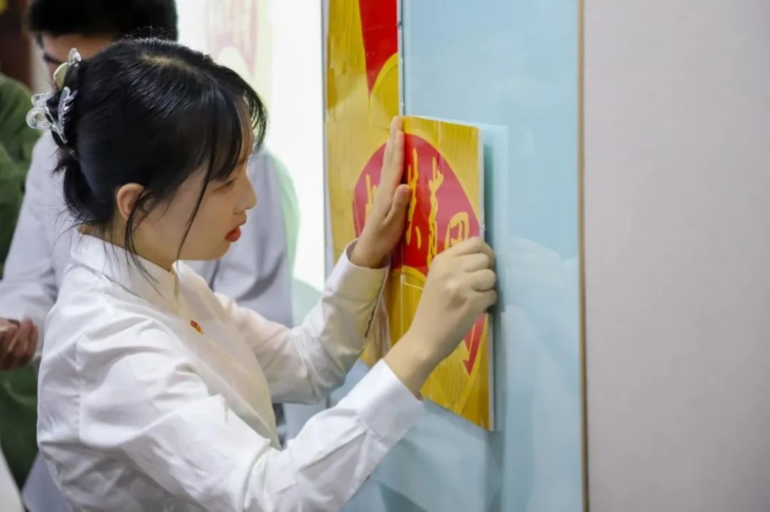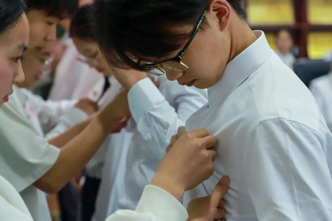 老团员们郑重地将团徽佩戴在新团员左胸前,这是团徽的传递,更是共青团员使命的传承。从新团员们戴上团徽的这一刻起,他们将用更高的标准要求自己,认清自己肩负的责任,用实际行动来表明自己无愧于共青团员的光荣称号。