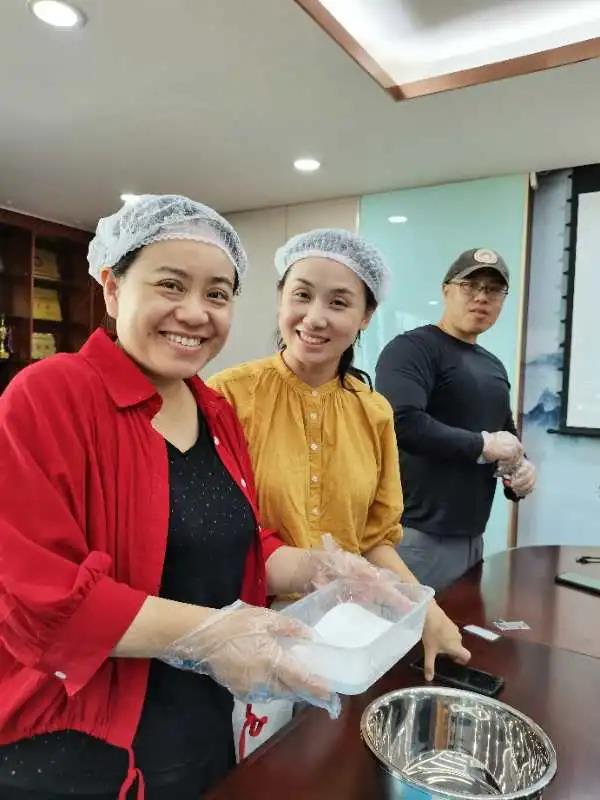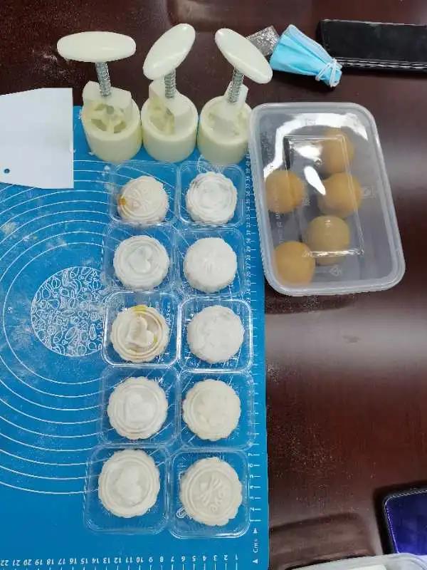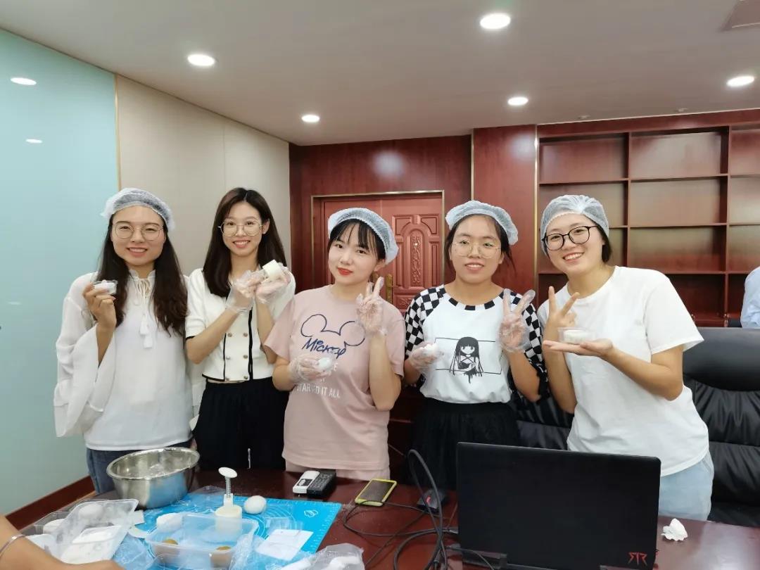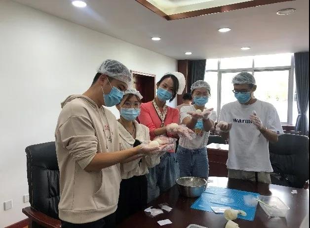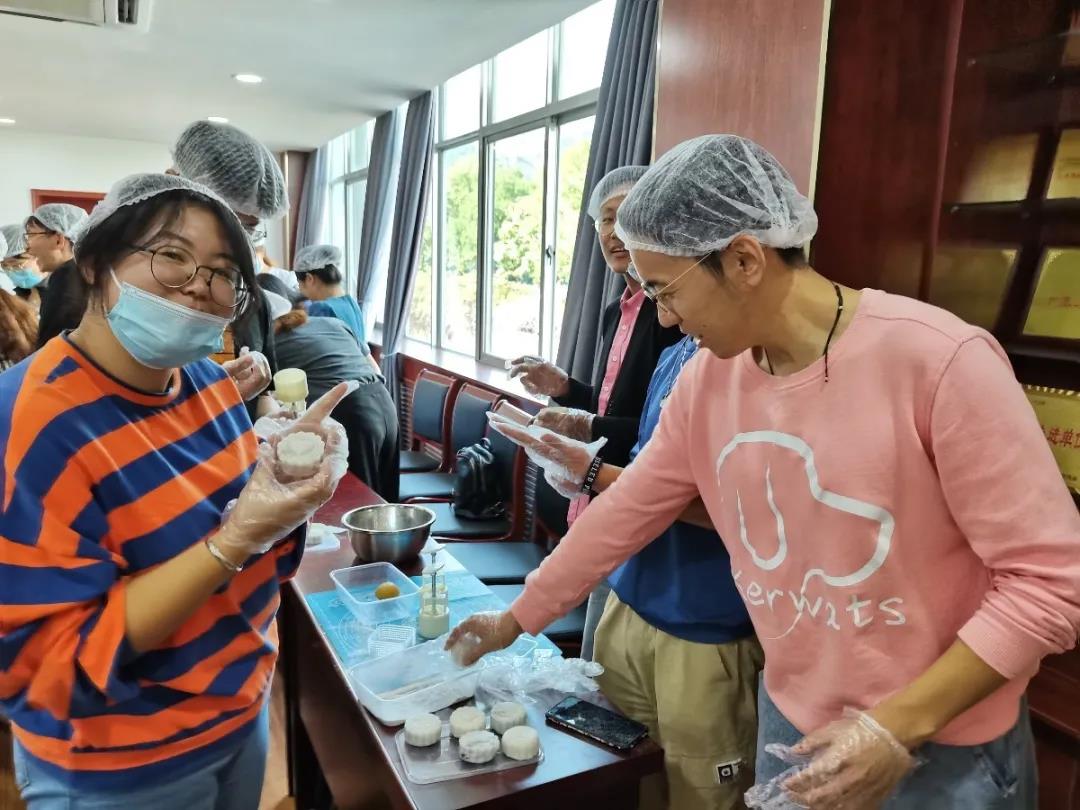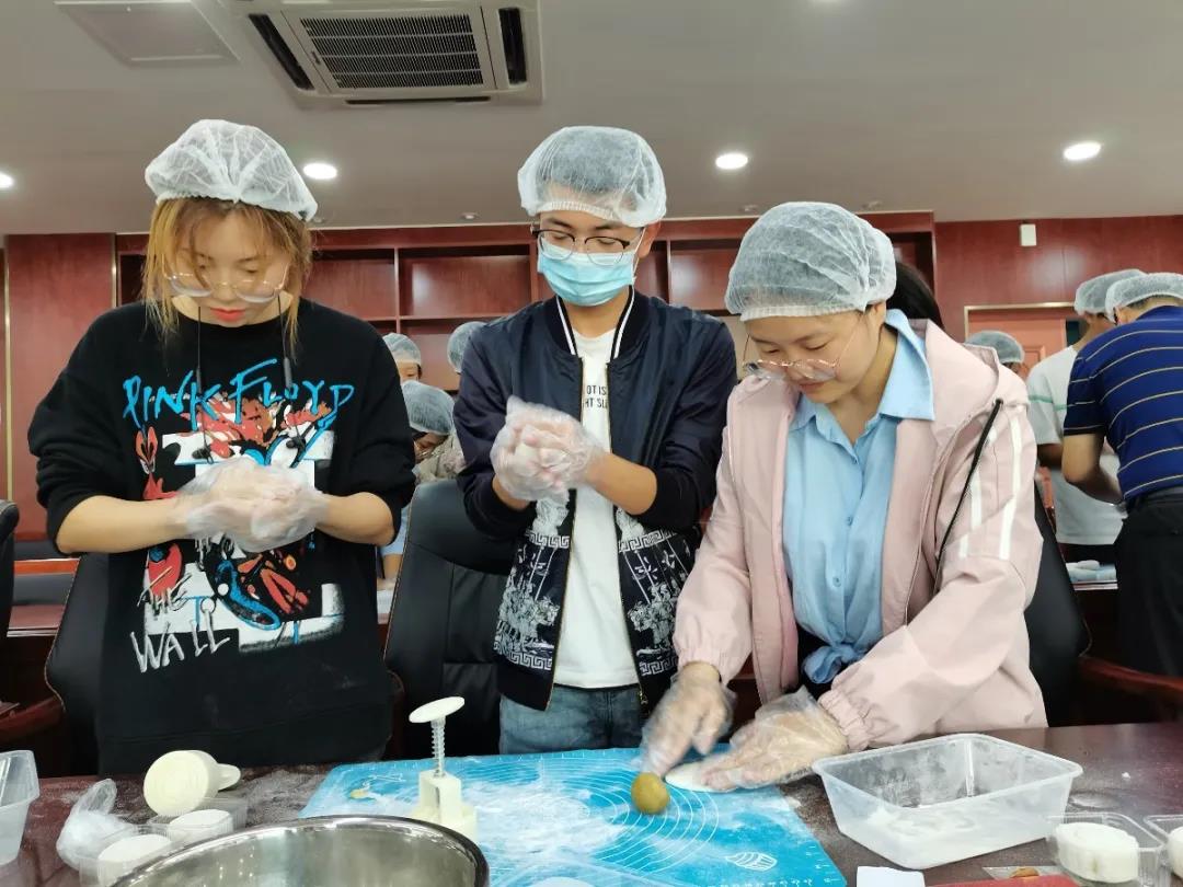 在国庆节和中秋佳节来临之际,为了更好的学习和传承文化,党员们亲手制作了象征阖家团圆的月饼。大家在专业人士的指导下,分工合作,和面、称重、压皮、包馅、按压,最后放进各种花纹的模具之中定型,每个步骤有条不紊,现场的气氛十分活跃,欢声笑语乐不停。
