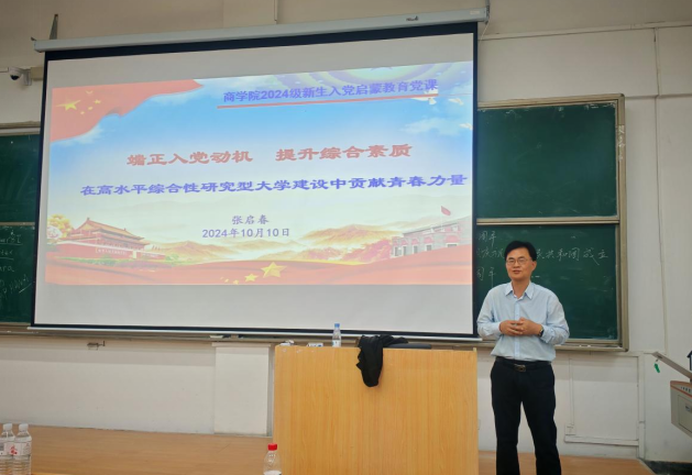 2024年10月10日下午, 第一场新生入党启蒙教育大会在金家岭校区西院1教111举行,九游棋牌官网 组织员张启春老师主讲,2024级会计学、管理科学与工程和供应链三个专业共211名新生聆听了此次讲座。