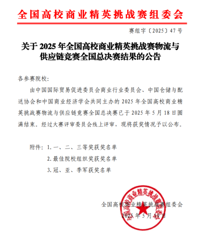 日前,由中国国际贸易促进委员会商业行业委员会、中国仓储与配送协会和中国商业经济学会共同主办的2025年全国高校商业精英挑战赛物流与供应链竞赛全国总决赛圆满落幕九游官网-九游棋牌 选派的牛贵艳、李文婷、杨志举、艾提排·穆合塔尔、陈妍五名学生组成的参赛团队作品《老字号企业供应链数字化转型实践与优化——以青岛食品为例》,从全国291组参赛队伍中脱颖而出,在本次“物流与供应链”竞赛中获得全国总决赛一等奖。