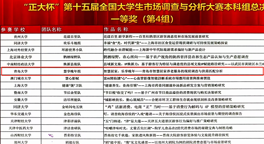 5月25日,“正大杯”第十五届全国大学生市场调查与分析大赛本科组总决赛在浙江财经大学圆满落幕。经过激烈角逐,王鑫、张月、段琪、刘楚儿、姜俊羽同学完成的作品《智慧居家,乐享晚年——青岛市智慧居家养老服务的现状调查与供需匹配分析》荣获全国总决赛一等奖。这是九游棋牌官网