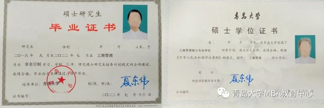 学员修满规定的学分,完成硕士论文并通过论文答辩,经学校审核批准后,授予国家教育部颁发的青岛大学研究生毕业证书和工商管理硕士(MBA)学位证书。