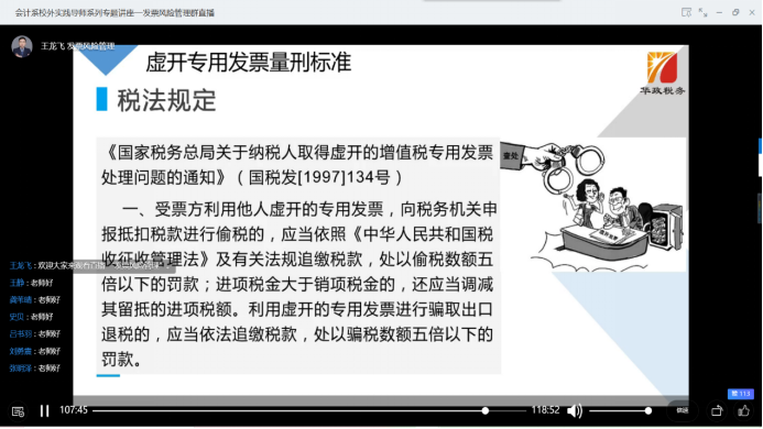 在最后虚增增值税发票风险部分的讲解中,王老师围绕“何为虚开增值税专用发票、不属于虚开增值税专用发票的情形以及虚开专用发票量刑标准”三方面进行了深入浅出地讲解,让同学们深刻的理解了虚增增值税发票的严重危害和后果。