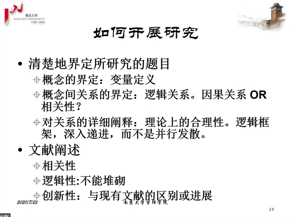 在阐述了如何进行研究话题的基础上,王教授又对“如何开展研究”进行分析和讲解,包括研究中概念的界定,概念之间的逻辑关系,国内外文献综述等,包括文献之间的逻辑性、相关性和创新性等等。