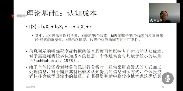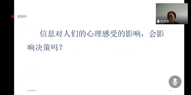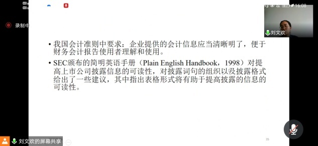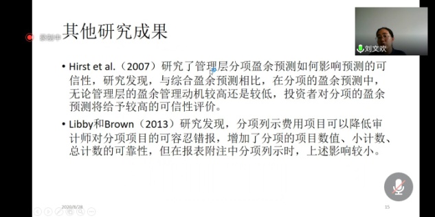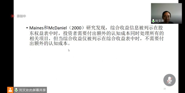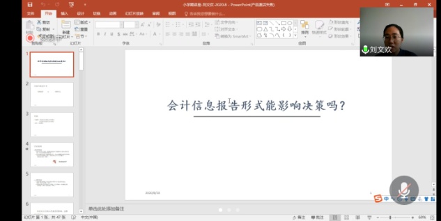 8月28日下午,“青岛大学卓越人才”刘文欢老师于腾讯会议做了题为“会计信息报告形式能影响决策吗”的讲座。会计学系鲍在山老师和部分同学参加了本次讲座。