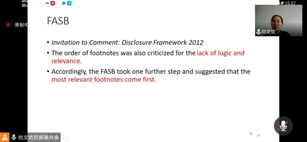 讲座开始,刘文欢老师说到:“决策不限于某一个群体,投资者的决策、管理层的决策都属于决策这一层面的内容”老师还提到近年来会计报表的形式和内容都发生了很大的变化,例如利润表中管理费用多了研发费用这个内容,这个变化对于利润表来说是内容上的变化,而对于公司财务报告来说却是形式上的变化。