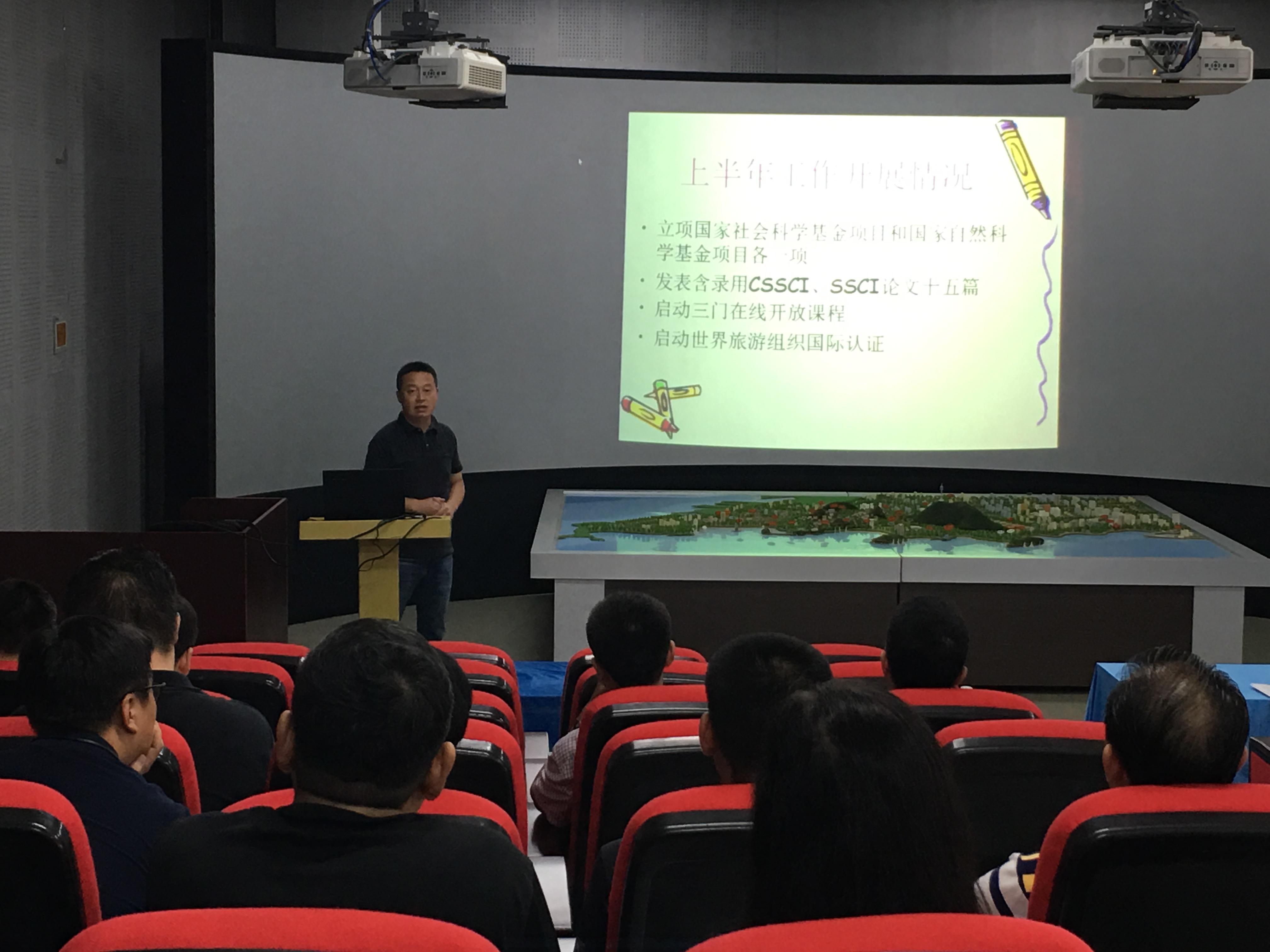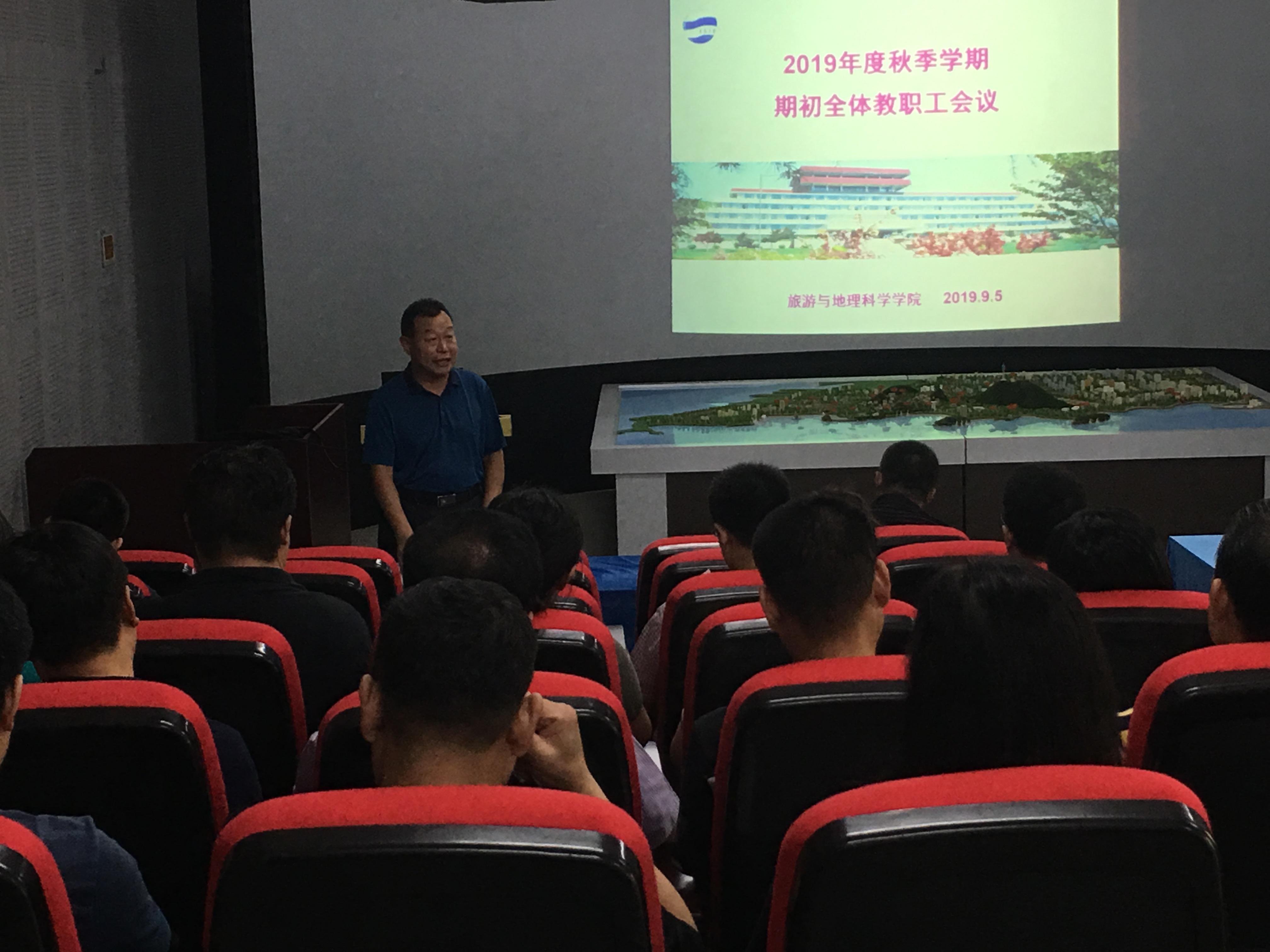 在数字旅游实验室召开全院教职工大会,传达学习学校党委全委(扩大)会议暨2019年暑期中层干部学习研讨班的会议精神,总结2019年上半年九游官网