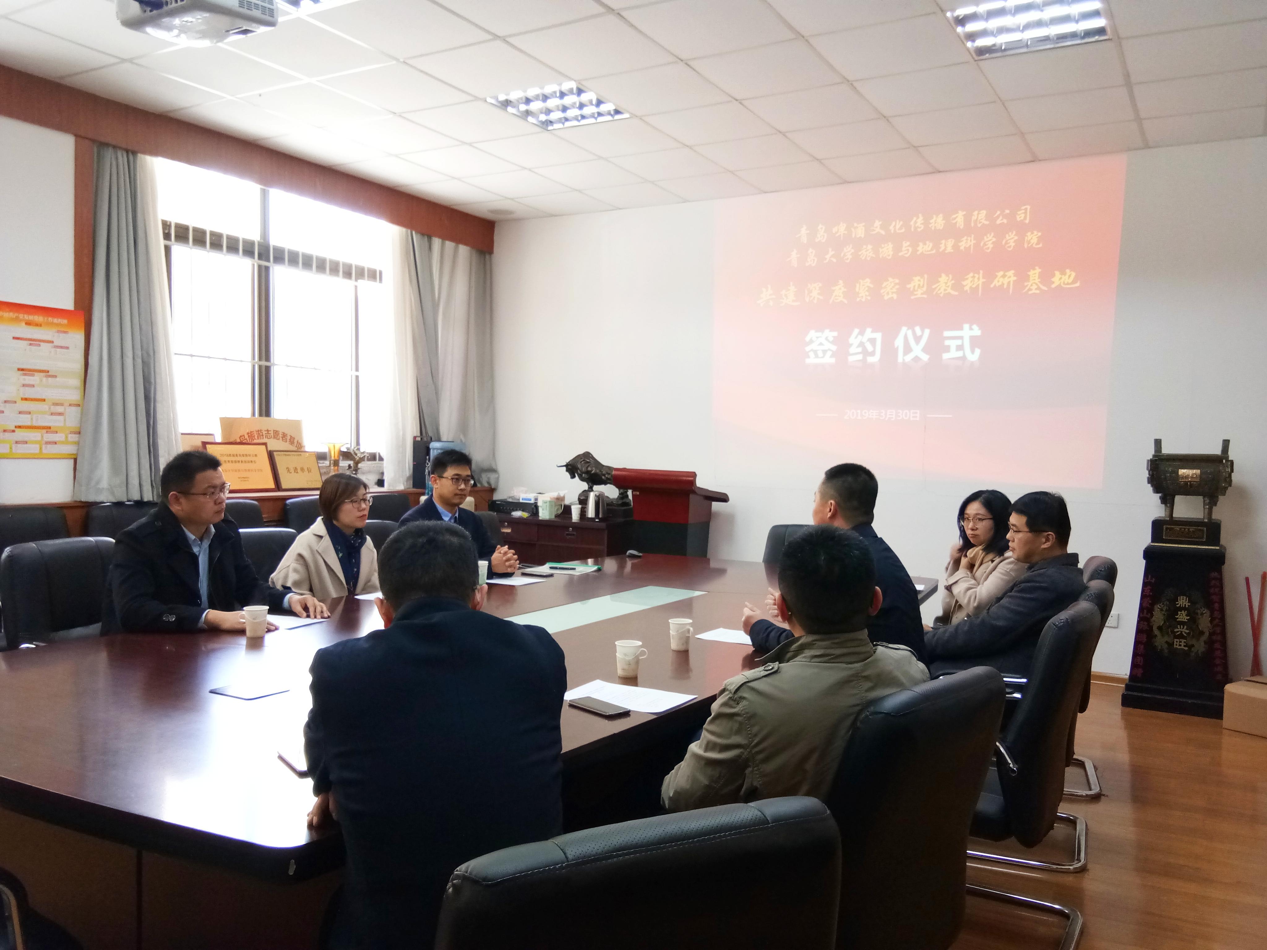 与青岛啤酒文化传播有限公司共建深度紧密型教科研基地签约仪式在浮山校区东院睿思楼122室举行。青岛啤酒文化传播有限公司管理者代表、总经理助理、人力资源部部长曾超、青岛啤酒博物馆接待处经理姜绪军、人力资源部副部长王文苑,我院院长肖建红、副院长耿庆汇、院长助理赵玉宗、酒店管理系主任高德宗、旅游与会展管理系徐翠蓉老师等出席本次签约仪式。