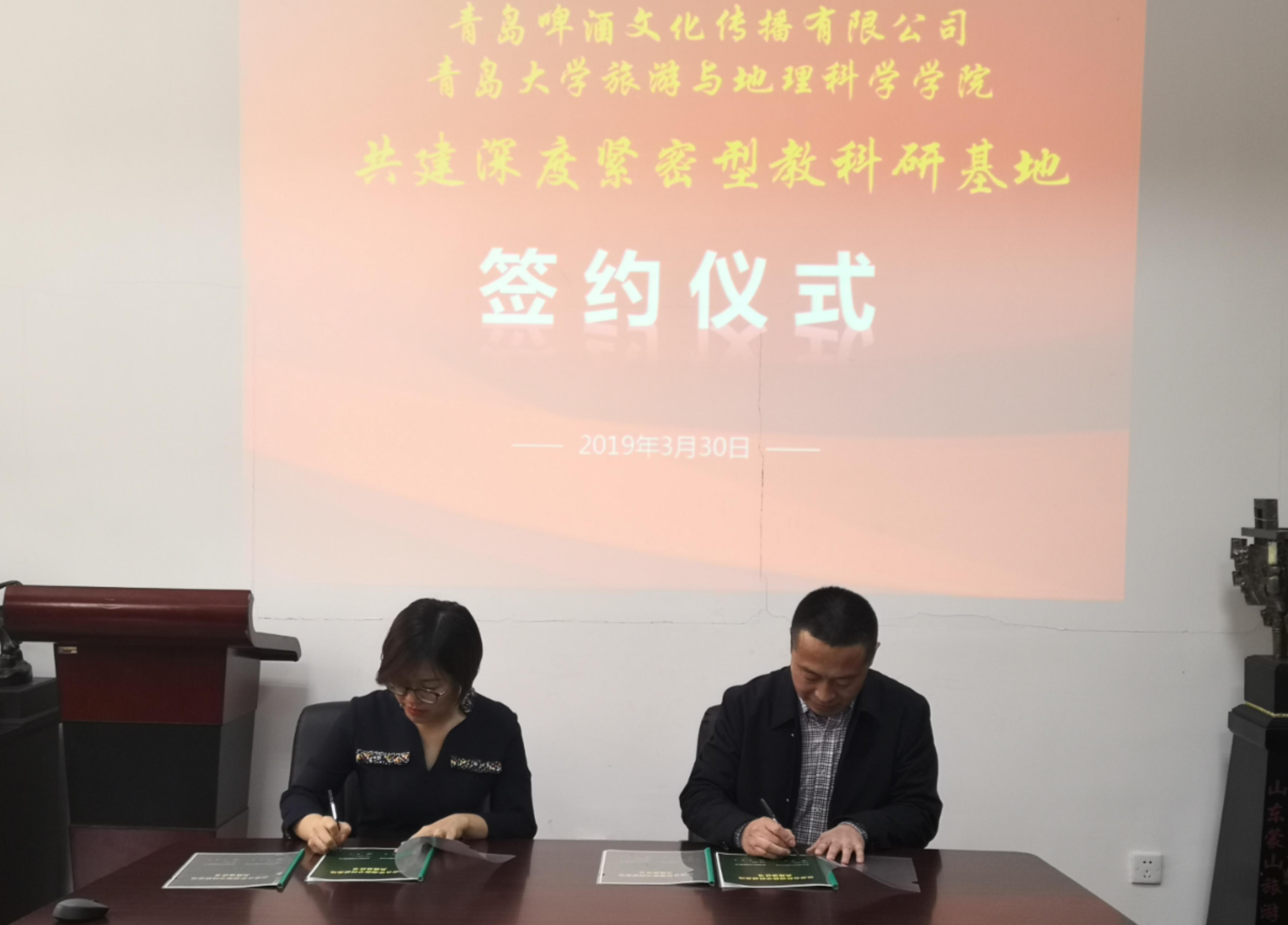的基本情况和育人理念,提出大学的核心职能是人才培养,作为应用型专业需要改变传统教学模式,打造开放式课堂,推进校企协同育人模式的探索。同时,肖院长建议双方围绕青岛啤酒文化深度挖掘、研学旅游开发、博物馆管理、文创产品研发等方面开展教研科研合作。青岛啤酒文化传播有限公司总经理助理曾超介绍了公司的基本情况和核心业务。作为青岛啤酒股份有限公司的全资子公司,青啤文化公司以青岛啤酒的百年品牌效应为核心资源,夯实工业旅游基础,发展青啤文化产业,致力于开发以青岛啤酒品牌精髓为核心的旅游和文化产品,弘扬青岛啤酒“激情成就梦想”的品牌主张,打造“情醉百年”的服务品牌。目前,公司主营业务包括青岛啤酒工业旅游(青啤博物馆和青啤二厂旅游)、特色青岛啤酒开发和销售业务、参与经营青岛国际啤酒节等板块。同时,她还介绍了公司的人才储备计划和人力资源培训体系,表达了双方长期合作的期待。最后,双方正式签约,互换协议,合影留念。