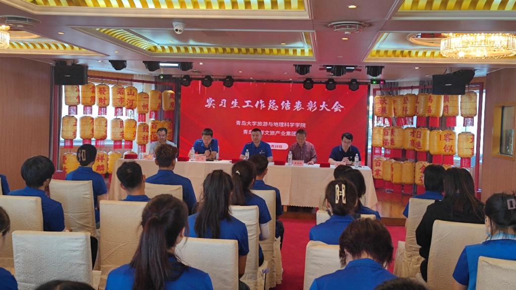2021级学生的“实习工作总结表彰大会”,在“蓝海珍珠”号游船一楼大厅召开。