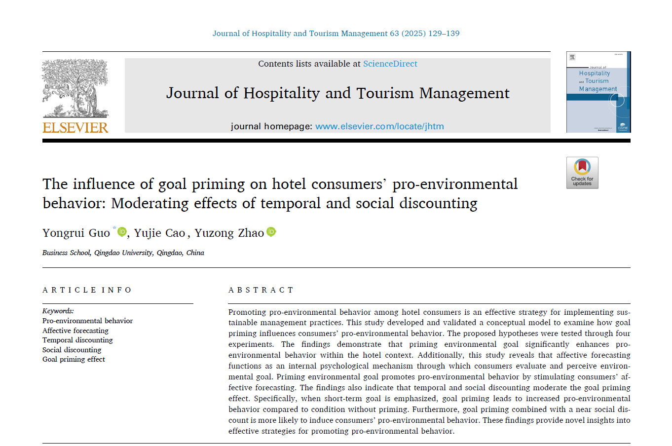 近日,由旅游管理系郭永锐教授(第一作者/通讯作者)、研究生曹雨洁、赵玉宗教授合作完成的原创性研究成果“The influence of goal priming on hotel consumers’ pro-environmental behavior: Moderating effects of temporal and social discounting”在国际权威期刊Journal of Hospitality and Tourism Management正式发表。青岛大学为第一作者和唯一通讯作者单位。Journal of Hospitality and Tourism Management是旅游管理和接待业领域的国际权威学术期刊,2024年影响因子为7.8,CiteScore值为14.9,为JCR一区期刊。