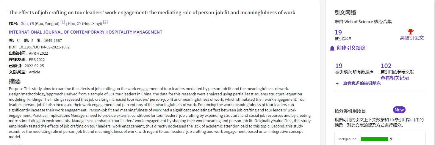 根据2023年1月Essential Science Indicators (ESI)数据库最新统计数据显示,我院郭永锐教授发表于国际接待业顶级期刊International Journal of Contemporary Hospitality Management,题目为“The effects of job crafting on tour leaders’ work engagement: the mediating role of person-job fit and meaningfulness of work”的论文被ESI收录为高被引论文。International Journal of Contemporary Hospitality Management是国际旅游、酒店及服务管理学界公认的顶级期刊之一,最新影响因子为9.321,为JCR一区期刊。该研究得到国家自然科学基金(41871126,41801135)等项目的资助。