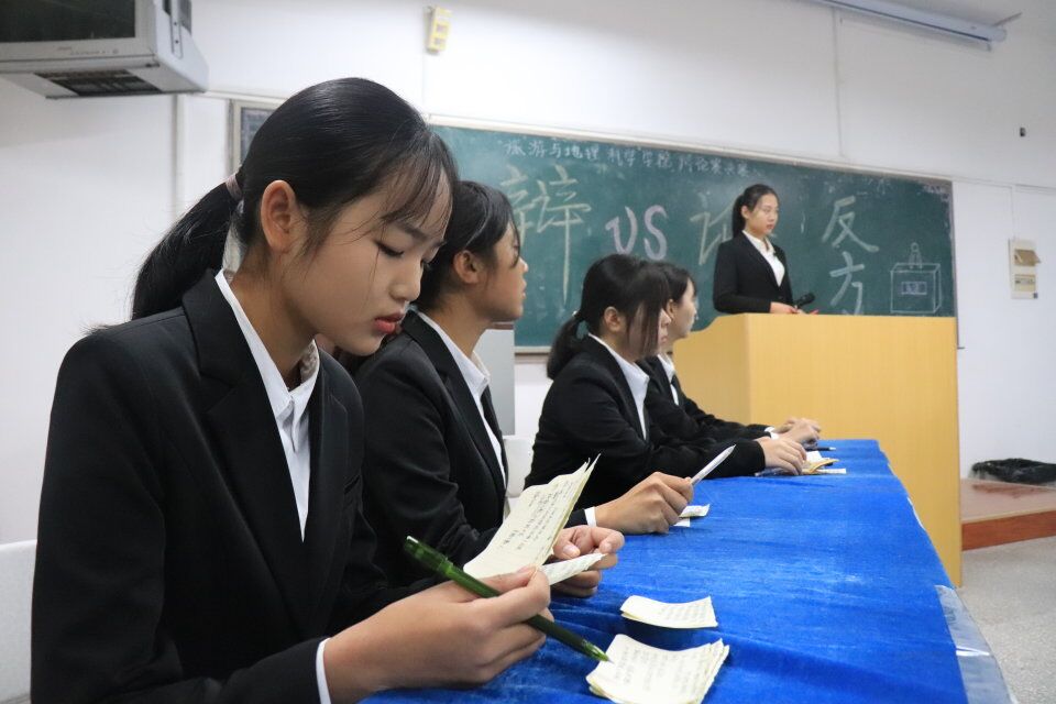 第十五届精英辩论赛决赛于青岛大学金家岭校区西院2号实验楼举行。往届精英辩论赛优秀辩手李林、张佳琪、钮春燕和杨佳乐担任本次决赛评委,2018级辅导员周昱宏老师、学生会主席王昱凯到场观看了本次比赛,参赛班级为旅游管理五班和地理科学二班。