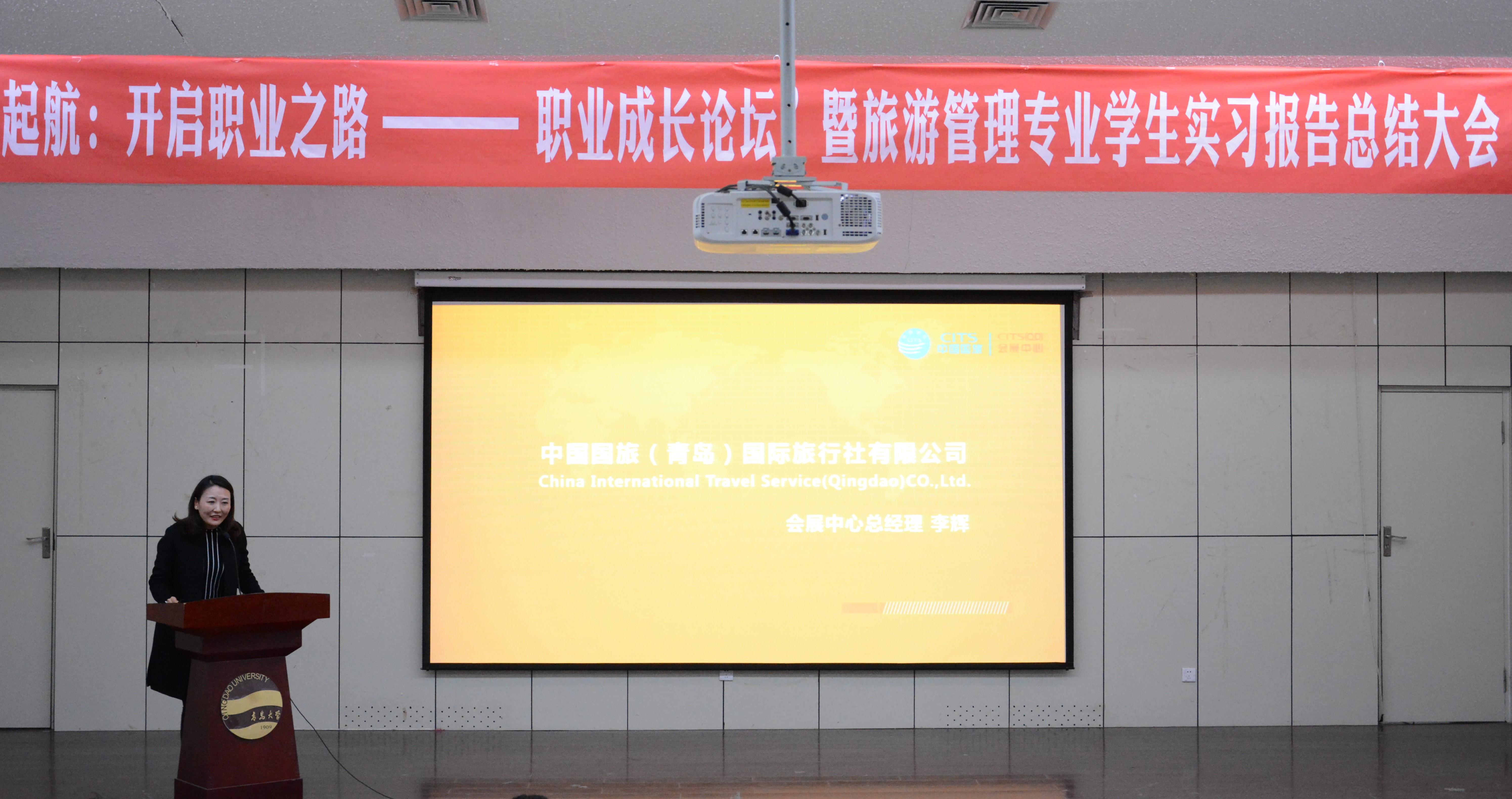 于青岛大学浮山校区图书馆报告厅举办“起航:开启职业之路—职业成长论坛”暨旅游管理专业学生实习报告总结大会。中国国旅(青岛)国际旅行社有限公司会议奖励旅游中心总经理李辉女士,山东堂庭文化旅游发展有限公司总经理宋飞先生、副总经理苗艳红女士,青岛铭加刀刀国际旅行社有限公司总经理张平亮先生,港中旅海泉湾度假区人力资源总监韩成虎先生、人力资源部人事主管张啸龙先生,青岛中德综合服务公司会展部徐俐菲女士、综合部薛建东先生及旅游与地理科学九游官网