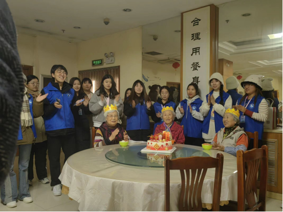 恰逢本月养老院共有三位老人生日,“旅尘志愿者服务队”学子为寿星们精心准备了蛋糕、长寿面。活动期间,志愿者与老人们亲切交流,陪他们唱歌、跳舞、弹琴,与他们练习八段锦,一幕幕感动瞬间架起了老一辈和青年人沟通的桥梁。