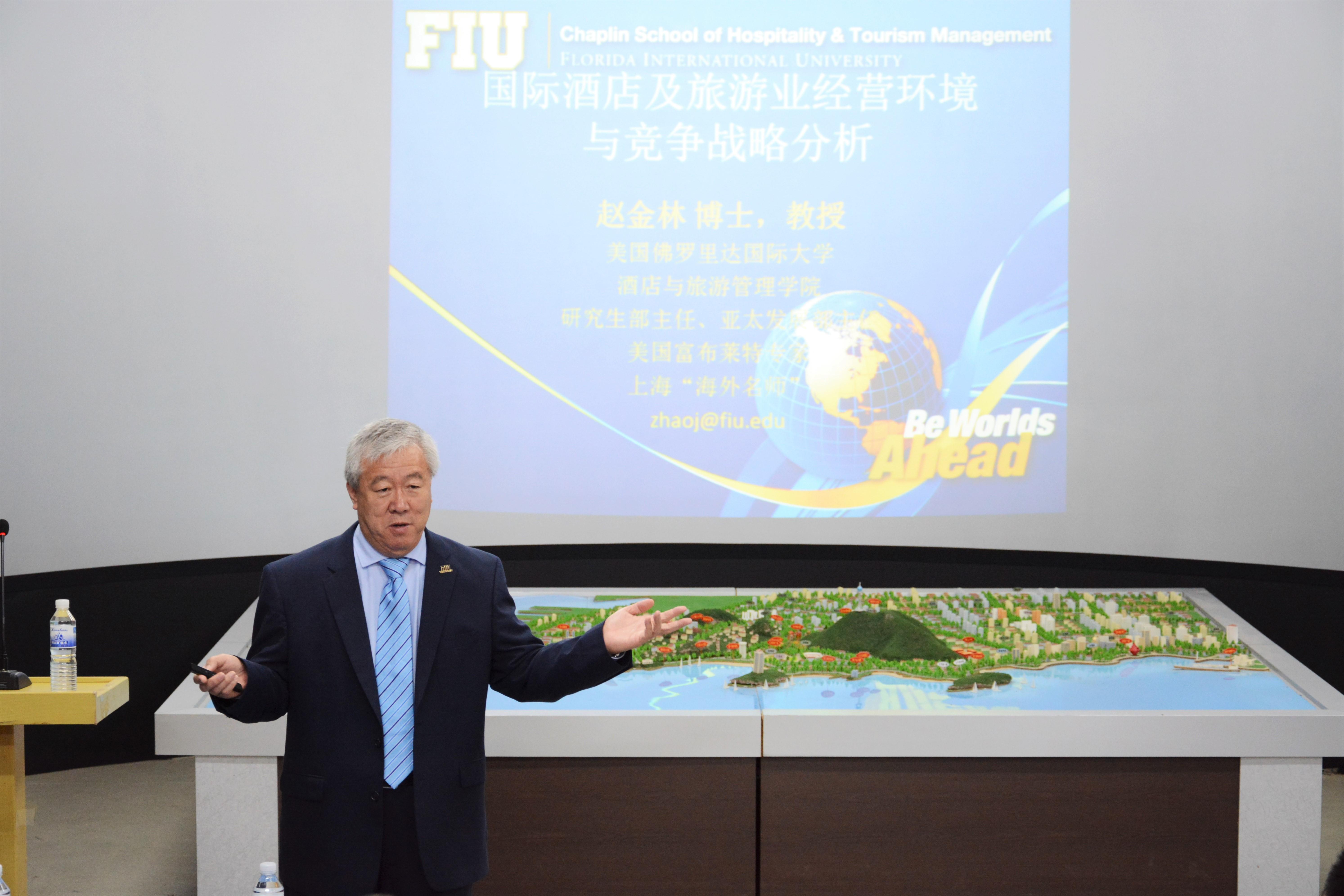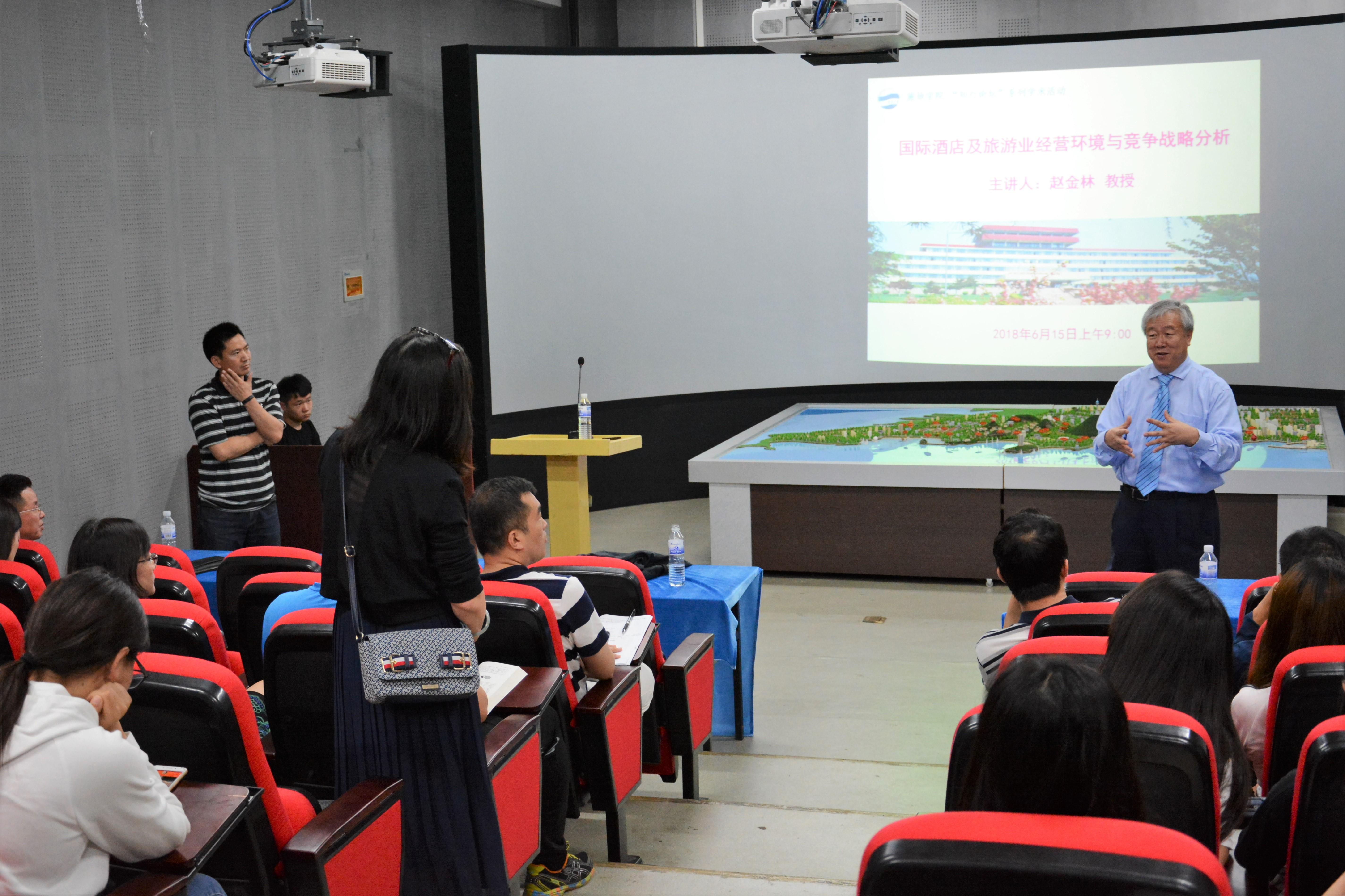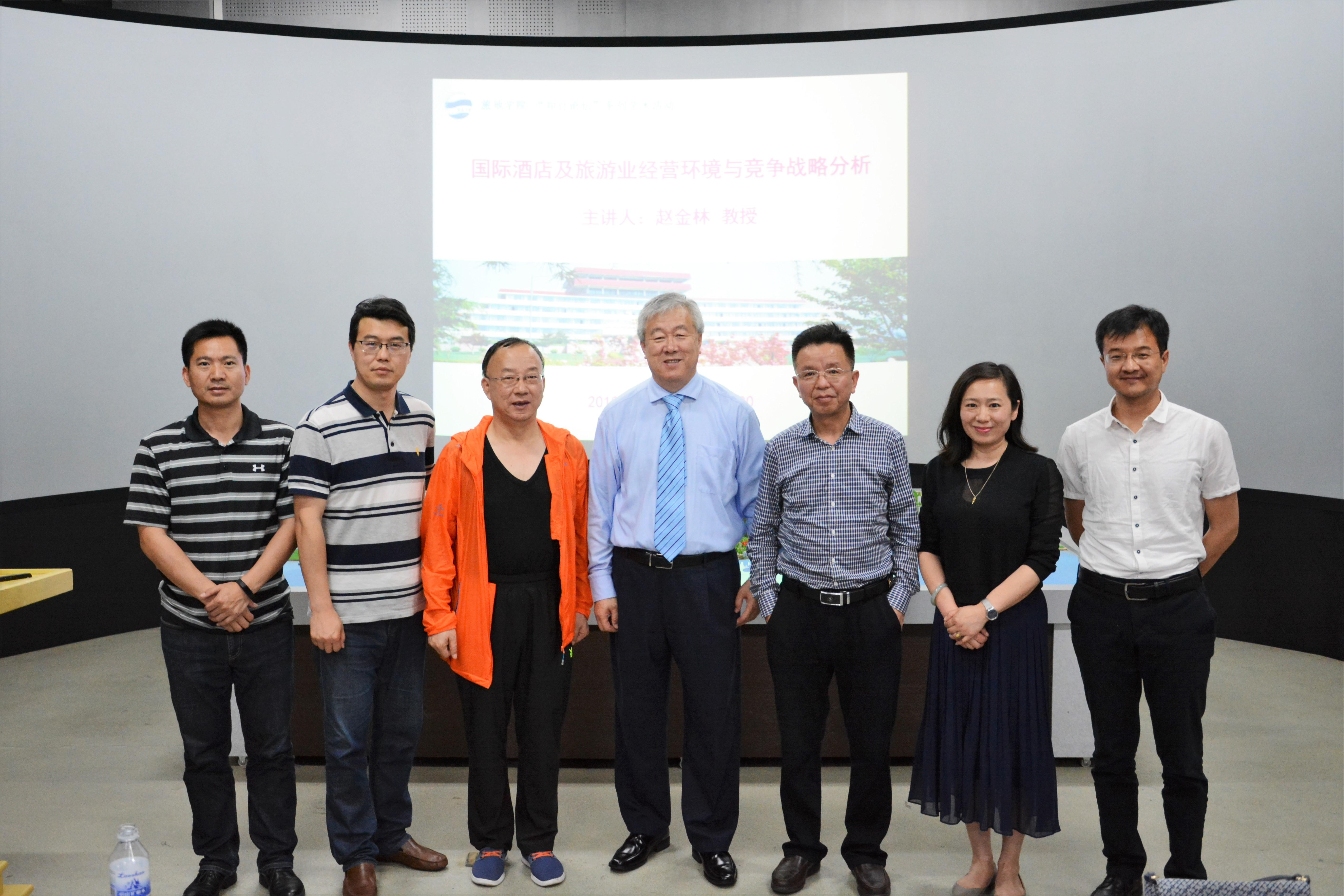 于青岛大学浮山校区静思楼2号旅游数字实验室举办“国际酒店及旅游业经营环境与竞争战略分析”学术交流会。本次交流会特邀美国佛罗里达州国际大学赵金林教授做学术报告,我院副院长张言庆主持本次交流会。