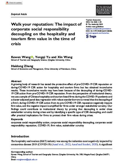 王克稳副教授、于永琪、王馨在Tourism Economics上发表“Walk your reputation: The impact of corporate social responsibility decoupling on the hospitality and tourism firm value in the time of crisis”。Tourism Economics是JCR经济学一区,旅游与休闲管理二区期刊,最新影响因子为4.4。王克稳副教授是论文的第一作者和通讯作者,青岛大学为论文的第一署名单位和通讯单位。