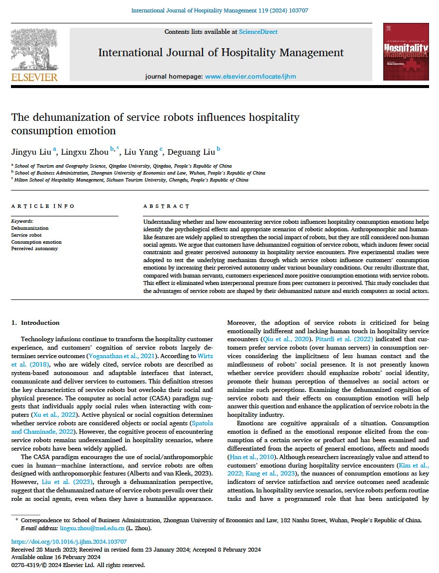刘晶瑜博士在International Journal of Hospitality Management上发表“The dehumanization of service robots influences hospitality consumption emotion”的研究成果。International Journal of Hospitality Management是JCR管理学一区、旅游与休闲管理一区期刊,最新影响因子为11.7。刘晶瑜博士是论文的第一作者,青岛大学为论文的第一署名单位。