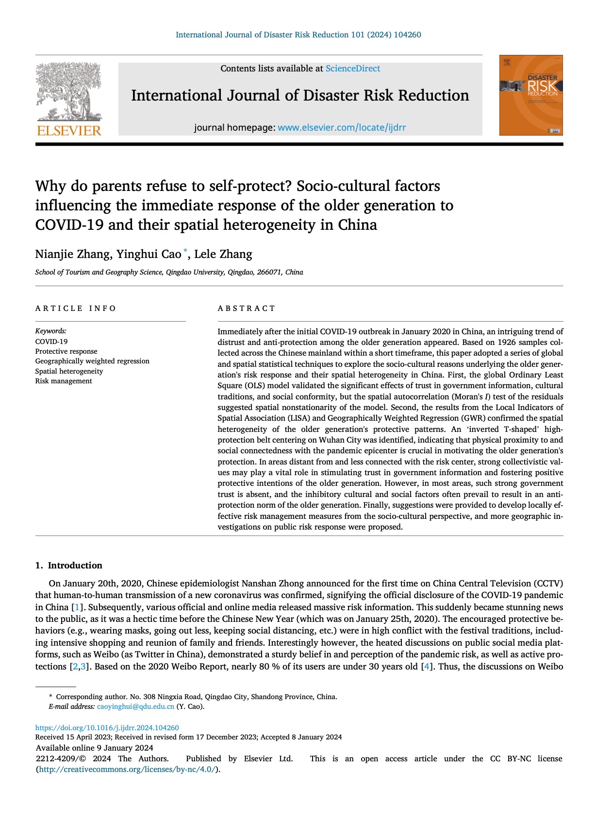 曹颖慧博士在灾害风险领域权威期刊《International Journal of Disaster Risk Reduction》(SCI一区,IF=5.0)发表题为“Why do parents refuse to self-protect? Socio-cultural factors influencing the immediate response of the older generation to COVID-19 and their spatial heterogeneity in China”的研究论文。青岛大学为论文唯一单位,曹颖慧博士为论文通讯作者。