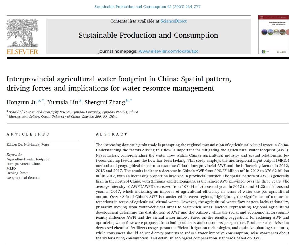 鞠洪润副教授及其研究团队在《Sustainable Production and Consumption》(SSCI Q1,IF=12.1)发表题为“Interprovincial agricultural water footprint in China: Spatial pattern, driving forces and implications for water resource management”的研究论文。青岛大学为论文第一署名单位,鞠洪润副教授为论文第一作者。该研究得到国家自然科学基金(42201311,42001243)、教育部人文社会科学基金(22YJCZH071,20YJC630212)等项目的资助。