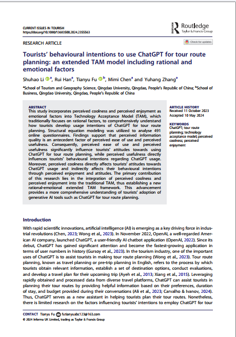 李书昊副教授研究团队在《Current Issues in Tourism》(SSCI一区,IF=8.0)发表题为“Tourists’ behavioural intentions to use ChatGPT for tour route planning: an extended TAM model including rational and emotional factors”的研究成果。李书昊副教授为论文第一作者,九游官网-九游棋牌