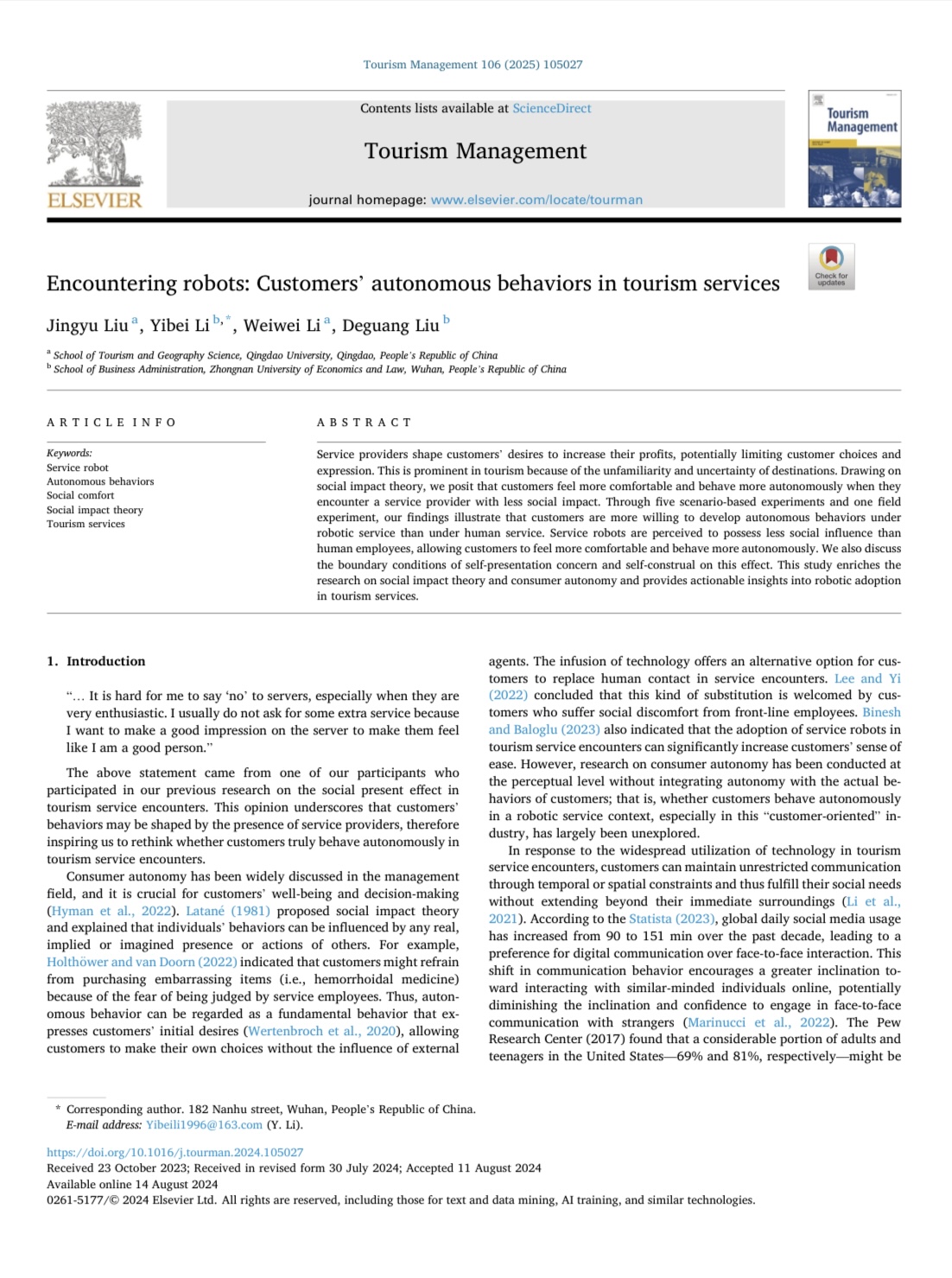 刘晶瑜博士研究团队在旅游管理领域国际公认的三大顶级期刊之一《Tourism Management》(SSCI一区, ABS 4星期刊)发表题为“Encountering robots: Customers’ autonomous behaviors in tourism services”的研究成果。刘晶瑜博士为论文第一作者,青岛大学为论文第一作者单位。