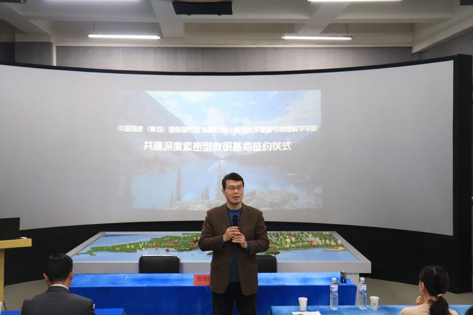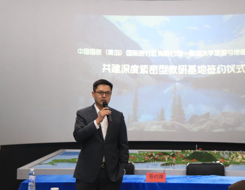 致辞,介绍了双方共建深度紧密型教研基地的背景与由来,展望了未来校企联合、产教融合,实现双方共赢的合作愿景。紧接着,中国国旅(青岛)旅行社有限公司出境旅游中心总经理赵青岭先生介绍了国旅背景、特色、规模以及发展计划,并对未来基地建设和合作给予期待。随后,耿庆汇老师和赵青岭先生分别代表双方签约。