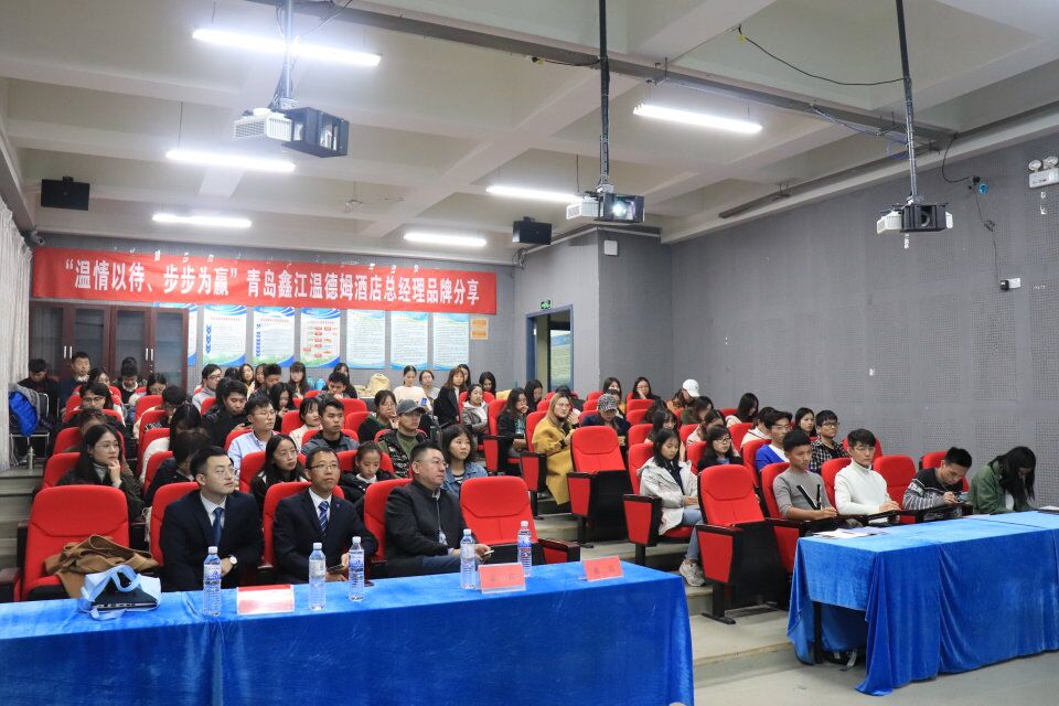 青岛鑫江温德姆酒店总经理品牌分享会于青岛大学浮山校区数字旅游实验室举行。青岛鑫江温德姆酒店总经理张晓东、行政管家杜丹、酒店管理系主任高德宗出席本次活动。2015级酒店管理系全体学生参加了本次活动。
