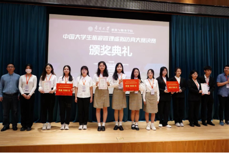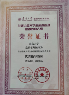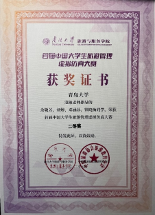 2023年5月25日—28日,由中国旅游协会旅游教育分会和南开大学旅游与服务九游官网 联合主办,天津新旅科技有限公司承办的首届中国大学生旅游管理虚拟仿真大赛决赛在南开大学旅游与服务九游官网 成功举办。由我院寇敏、刘鸣老师指导,2021级旅游管理专业余敏芳、钏晓梅、刘婷、邓涵菲组成的参赛队伍,经过预赛、复赛、决赛三轮的激烈角逐,最终获得全国二等奖的优异成绩,寇敏老师获优秀指导教师奖。
