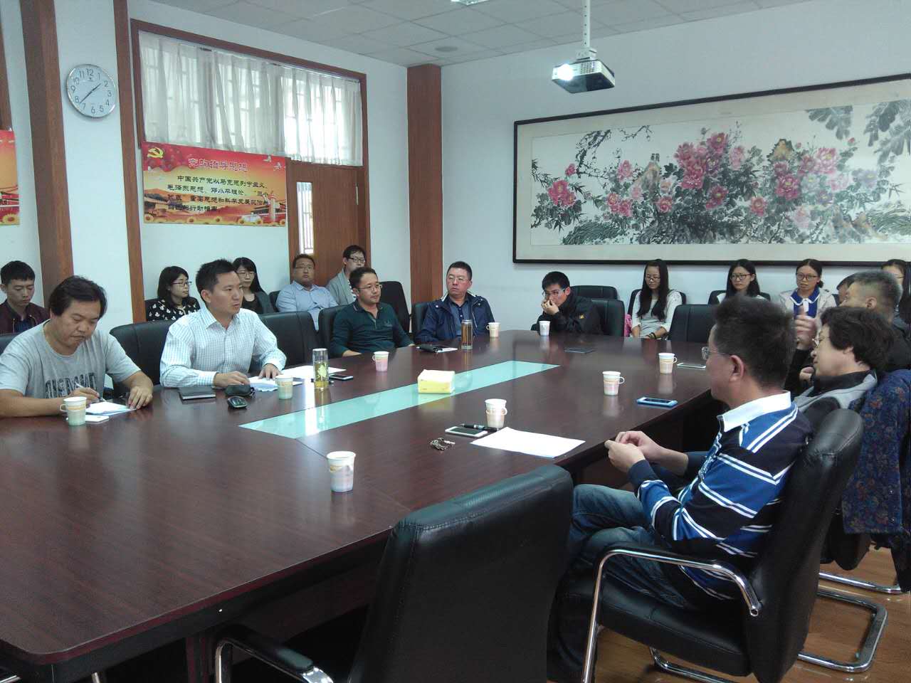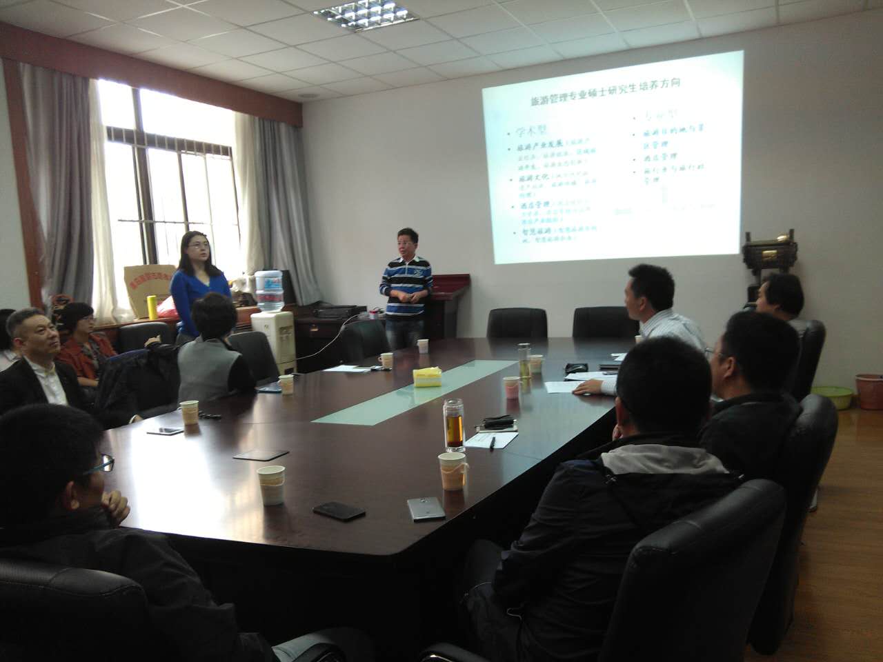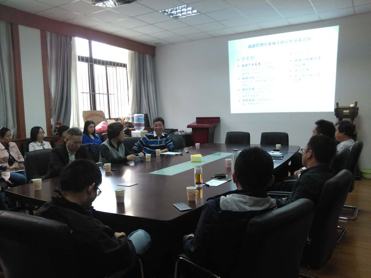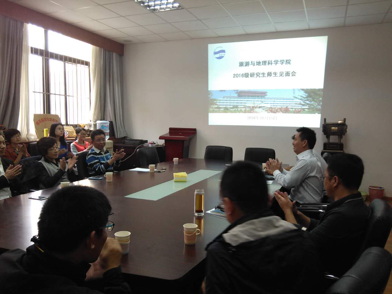 会议室顺利召开。出席本次会议的有马波教授、师守祥教授、张言庆副教授、赵玉宗副教授、郭为副教授、王平副教授、高德宗副教授、山东老转村美食娱乐有限公司牛虎兵总经理、港中旅国际(山东)旅行社有限公司田平总经理等研究生导师以及2016级硕士研究生,见面会由九游官网