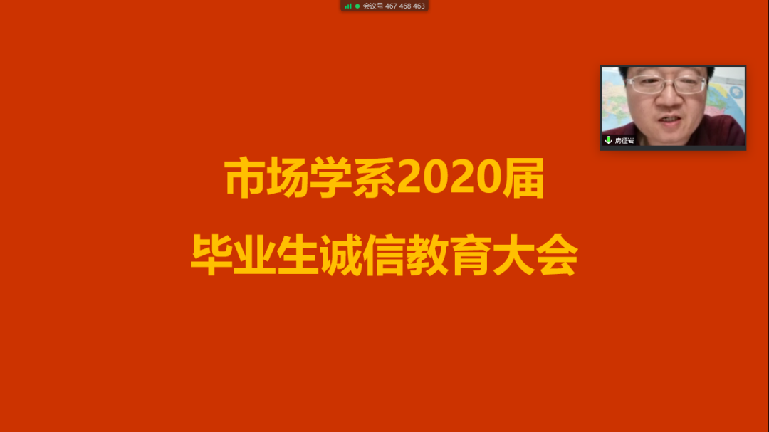 市场学系举行2020届毕业生诚信教育大会。会议采取腾讯会议的方式,由市场学系辅导员房征岩老师主持,就市场学系2020届生源地信用助学贷款毕业生办理贷款信息确认及诚信还款教育相关事项进行了解读发言。