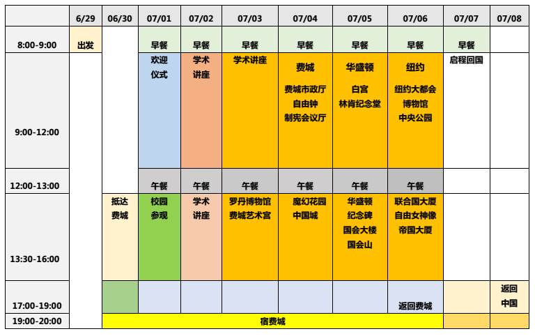 行程设置共包括学术课程及文化体验两部分,学生可充分体验美国校园文化,感受美国学术氛围。